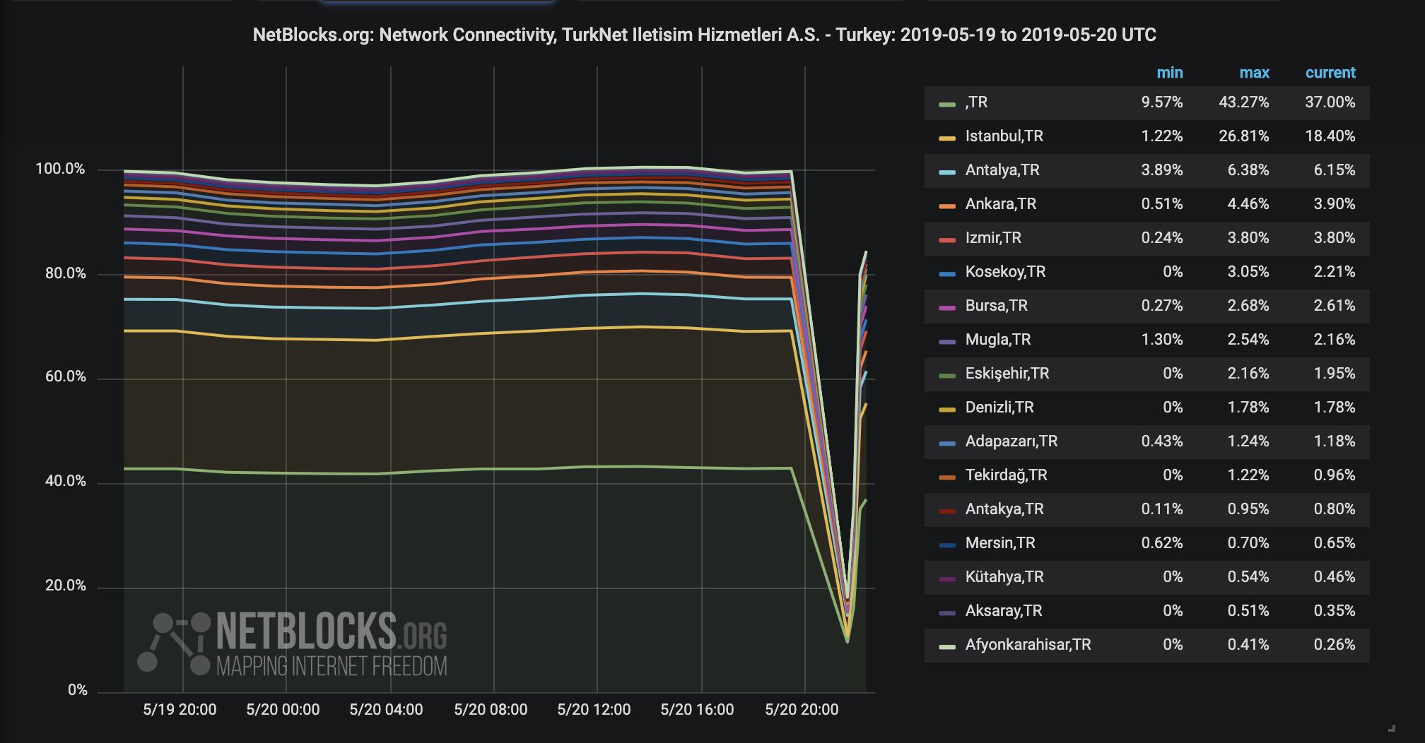 Turkey Blocks On Twitter Confirmed Internet Provider Turknet Is Experiencing Nationwide Outages As Of 9 00 P M Utc 12 00 A M Trt Latest Network Data Shows Connectivity Restored From 18 To 85 But Some